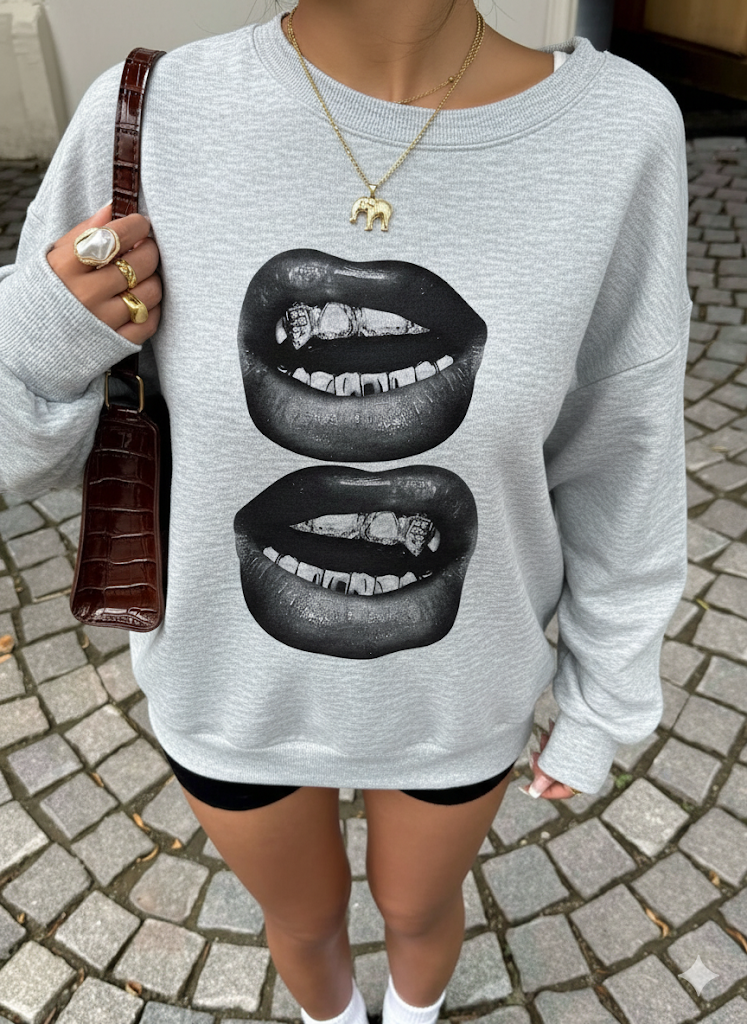 Kadın gri oversize sweatshirt modeli, ön kısmındaki büyük siyah dudak baskısı ile sokak stiline modern ve cesur bir hava katıyor. Rahat kalıbı sayesinde günlük kombinlerde konfor sağlar. Yumuşak kumaşıyla dört mevsim kullanılabilir. Spor ayakkabı, şort, tayt veya kot pantolonlarla kolayca kombinlenebilir.