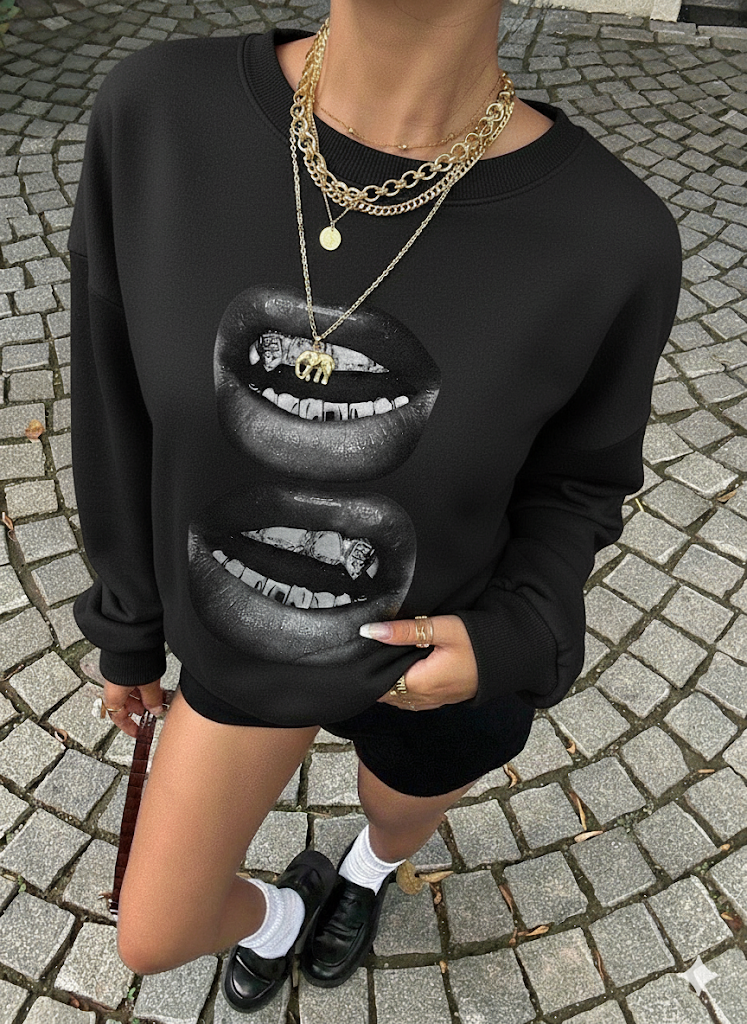 Kadın siyah oversize sweatshirt modeli, ön kısmındaki büyük siyah dudak baskısı ile sokak stiline modern ve cesur bir hava katıyor. Rahat kalıbı sayesinde günlük kombinlerde konfor sağlar. Yumuşak kumaşıyla dört mevsim kullanılabilir. Spor ayakkabı, şort, tayt veya kot pantolonlarla kolayca kombinlenebilir.